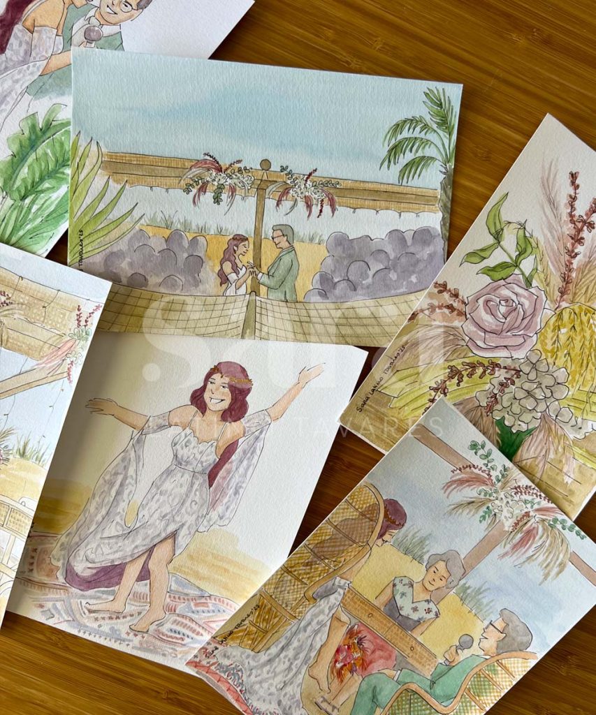 Frames desenhados a caneta e coloridos a aguarela que registam de forma autêntica e especial os melhores momentos de um evento.
